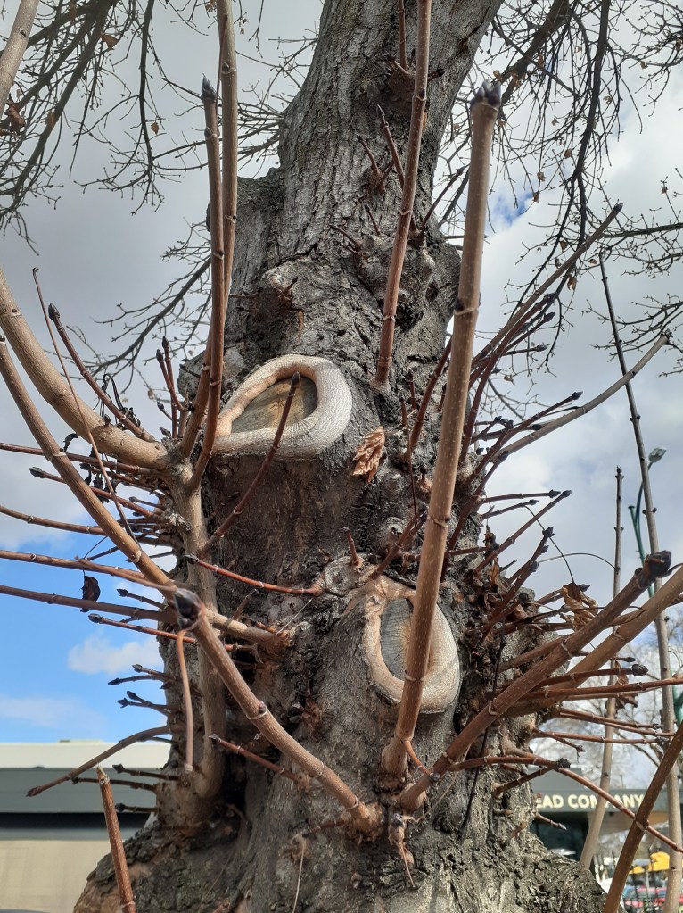 Epicormic shoots in the spring of 2023. The tree is attempting to close the wounds