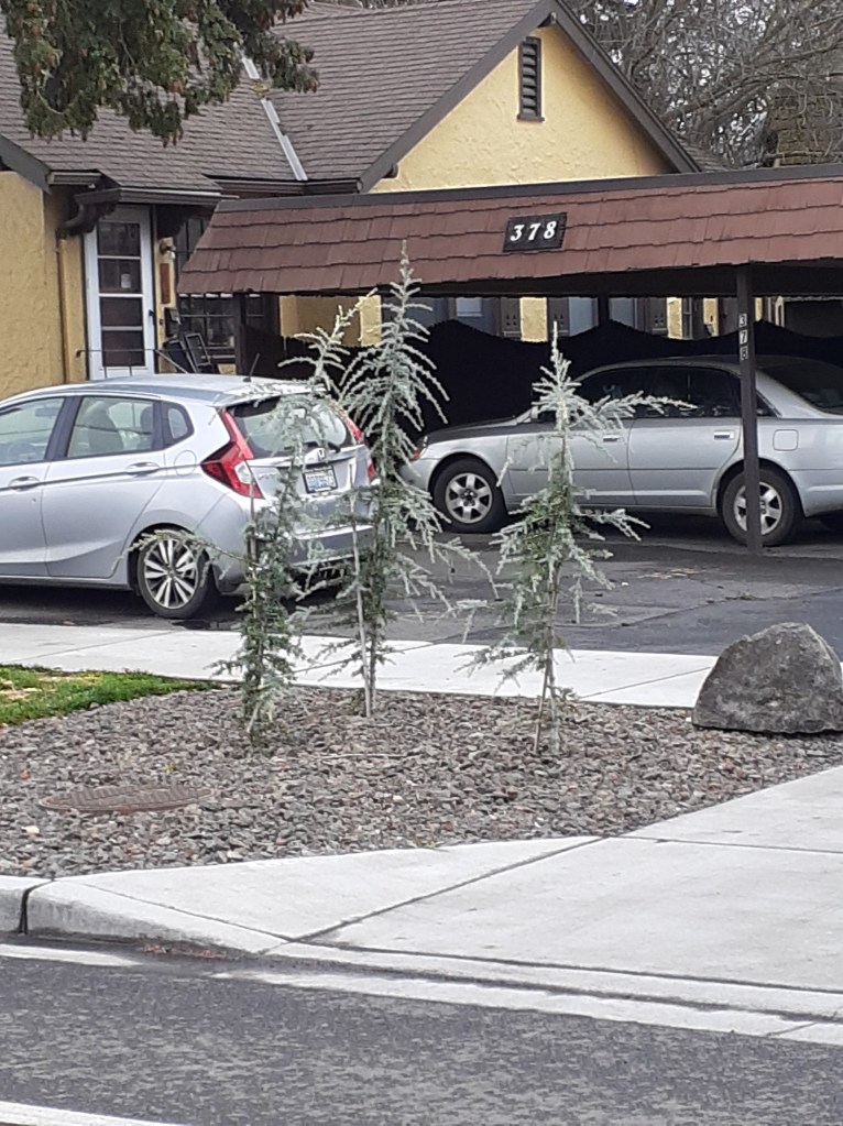 The trees in the image below are planted in a graveled corner of a planting strip, directly over water mains for the apartments in the background. When we spoke with the property manager for the apartments, telling him what these trees would become, he responded: